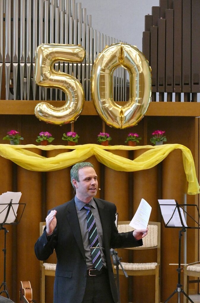 Seit einem halben Jahrhundert ist die Gemeinde ein Ort für Taufen, Kindersegnungen, Hochzeiten und zahlreiche persönliche Glaubensgeschichten. Goldene „50“-Ballons und historische Fotos aus der Bauzeit erinnerten daran, wie treu Gott die Gemeinde durch all die Jahre geführt hat.